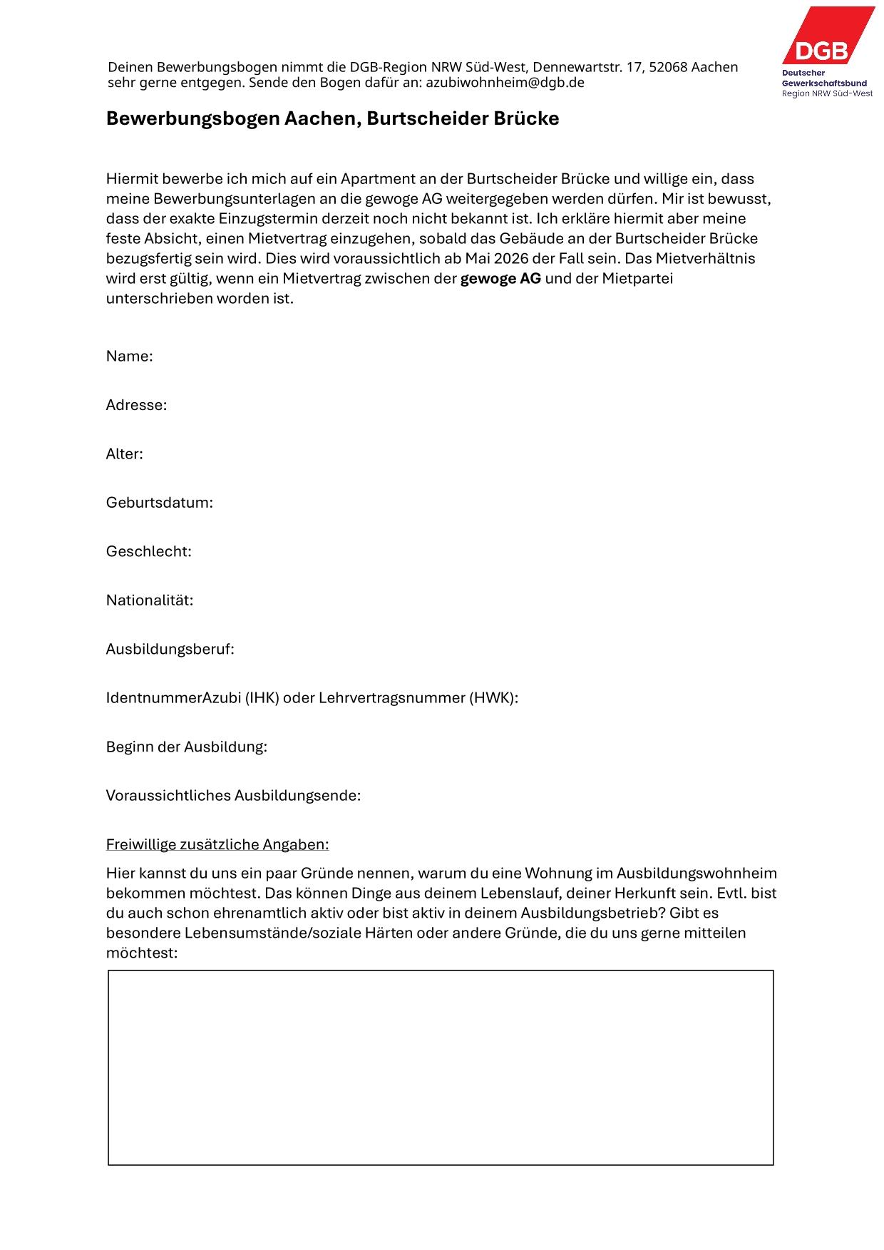 Das Bündnis Ausbildungswerk Aachen – bestehend aus DGB, IG Metall-Jugend, AWO, IHK, HWK, Mieterverein und der Stadt Aachen – hat erreicht, dass junger Wohnraum in bester Lage Realität wird. Der Neubau oberhalb der Burtscheider Brücke am Hauptbahnhof bietet künftig 112 moderne Apartments speziell für Auszubildende.